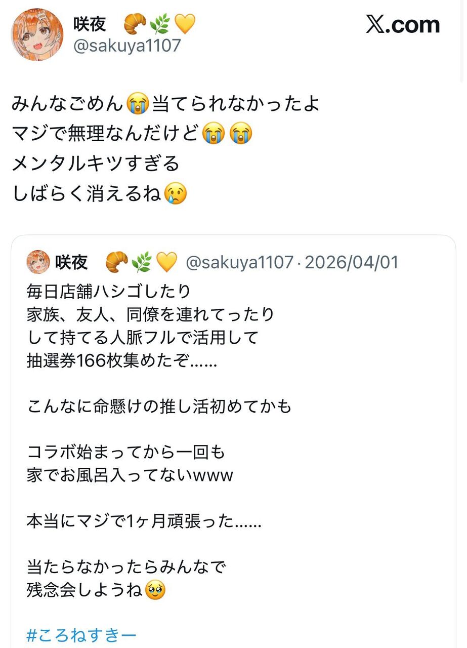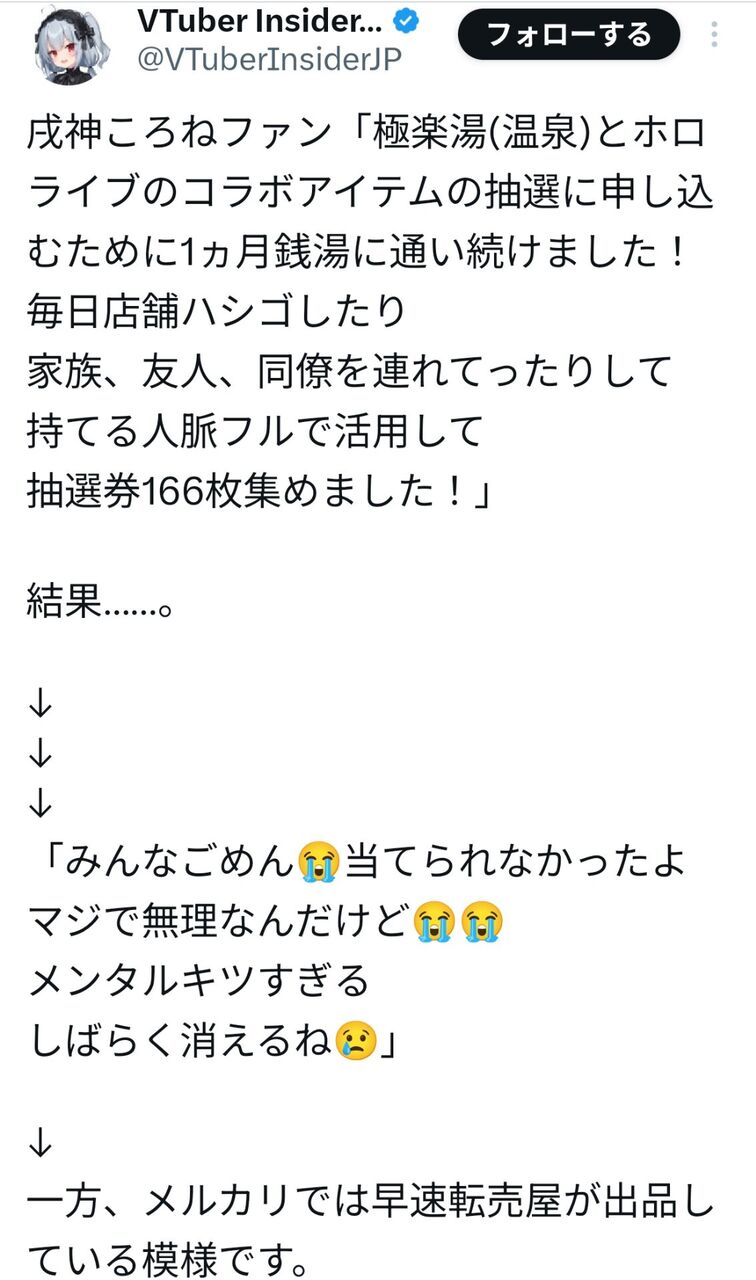 【悲報】極楽湯のホロライブコラボに1ヶ月通い詰めて166枚の抽選券を集めた豚さん、当てられずにメンタルを病む