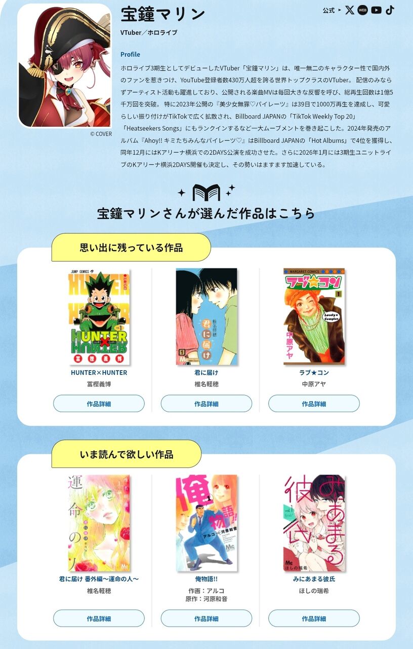 【画像】宝鐘マリンさんが選ぶ思い出に残っている集英社の漫画が発表される🎉