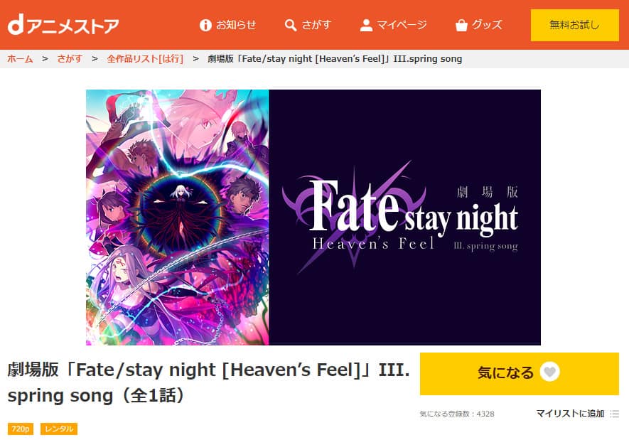 dアニメストア:Fate/stay night -Heaven’s Feel-Ⅲ.spring song 劇場版