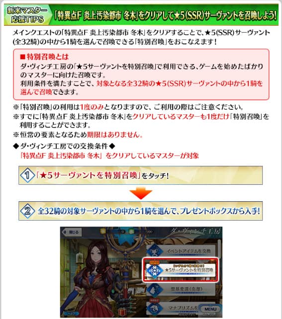 「特異点F汚染都市 冬木」をクリアすると、★5(SSR)サーヴァント(全32騎)から1騎「特別召喚」からもらえます