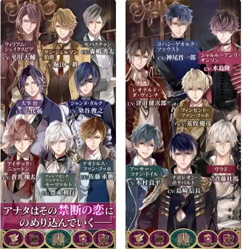 イケメンヴァンパイアの魅力は、なんといってもイケメンキャラクターたちです。歴史上の偉人たちをモチーフにしたキャラクターたちは、それぞれが個性的で魅力的です。プレイヤーは、自分の好みのキャラクターを選んで、恋愛ストーリーを進めていくことができます。
