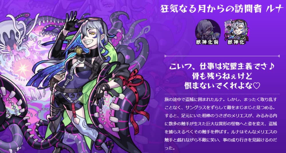 月から地球へとやってきた月の女神。突飛で破天荒な言動と、誰も読むことができない予想の斜め上をいく思考が特徴で、暗がりの生活に慣れているせいで急な明るさを苦手としており、そのため常時サングラスを装着している。様々な食べ物を食べて魔力を蓄え、月の力を増幅させるために地球を旅している自称美食家だが、悪食であり、どんなものでも食べてしまう。ちなみに月の魔力の増幅は太陽の勢力を侵す侵略行為でもあるため、ルナは太陽神から毛嫌いされている。そんなルナが持つ魔力は、存在しているだけで周囲に狂気を振りまくという厄介なもので、彼女と長く一緒にいた者は徐々に精神が汚染されてトランス状態に似た感覚に陥ってしまうが、ルナ本人はその力を楽しんでおり、自分の周囲にいる人々がトランス状態になる姿を見たいがために魔力を蓄える美食の旅をしている節がある。