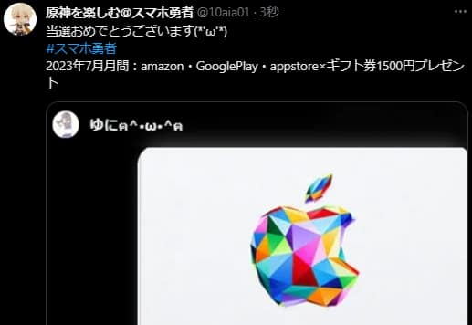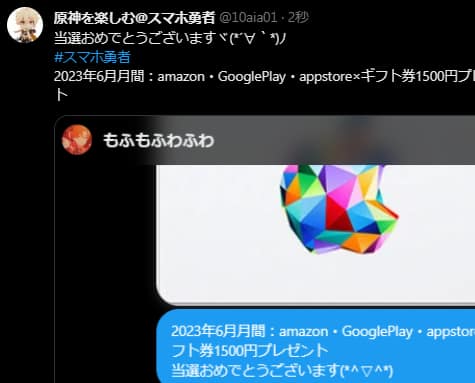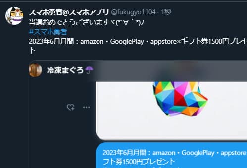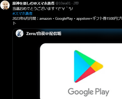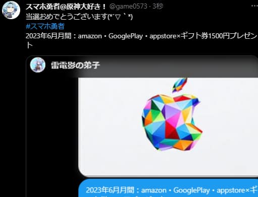 2023年6月月間:amazon・GooglePlay・appstore×ギフト券1500円プレゼント、 応募:フォロー&リツイートをお願いします。6月30日〆
