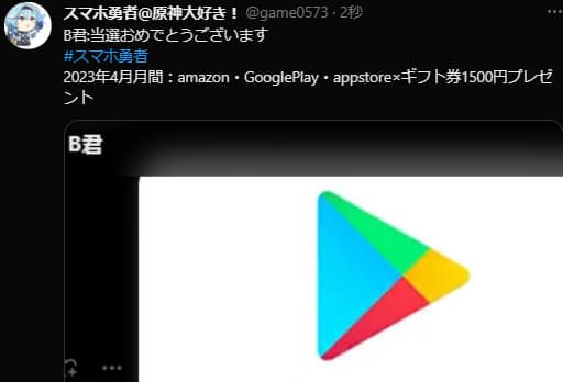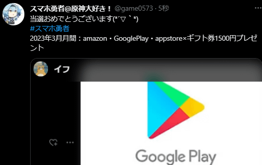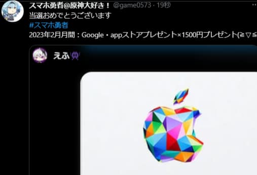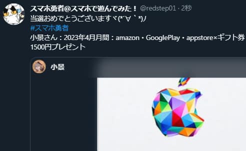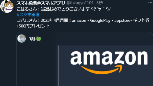 2023年4月月間:amazon・GooglePlay・appstore×ギフト券1500円プレゼント、 応募:フォロー&リツイートをお願いします。4月30日〆