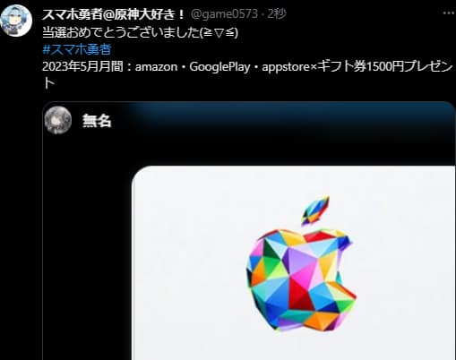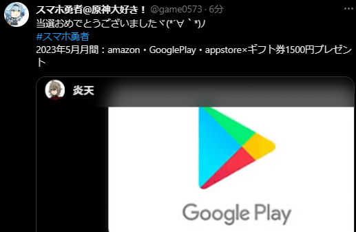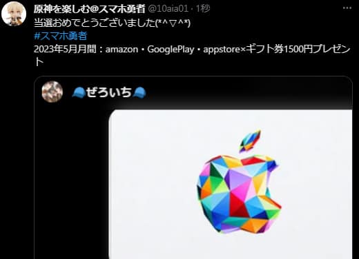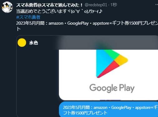2023年5月月間:amazon・GooglePlay・appstore×ギフト券1500円プレゼント、 応募:フォロー&リツイートをお願いします。5月31日〆