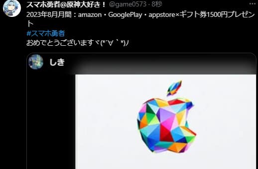 2023年8月月間:amazon・GooglePlay・appstore×ギフト券1500円プレゼント、 応募:フォロー&リツイートをお願いします。8月31日〆