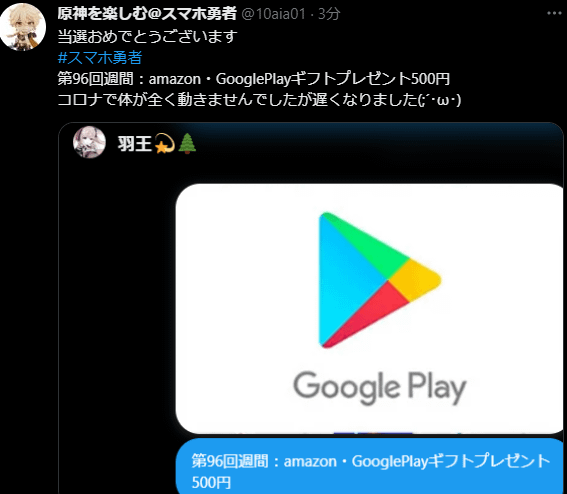 第96回週間:amazon・GooglePlayギフトプレゼント500円 11月26日〆